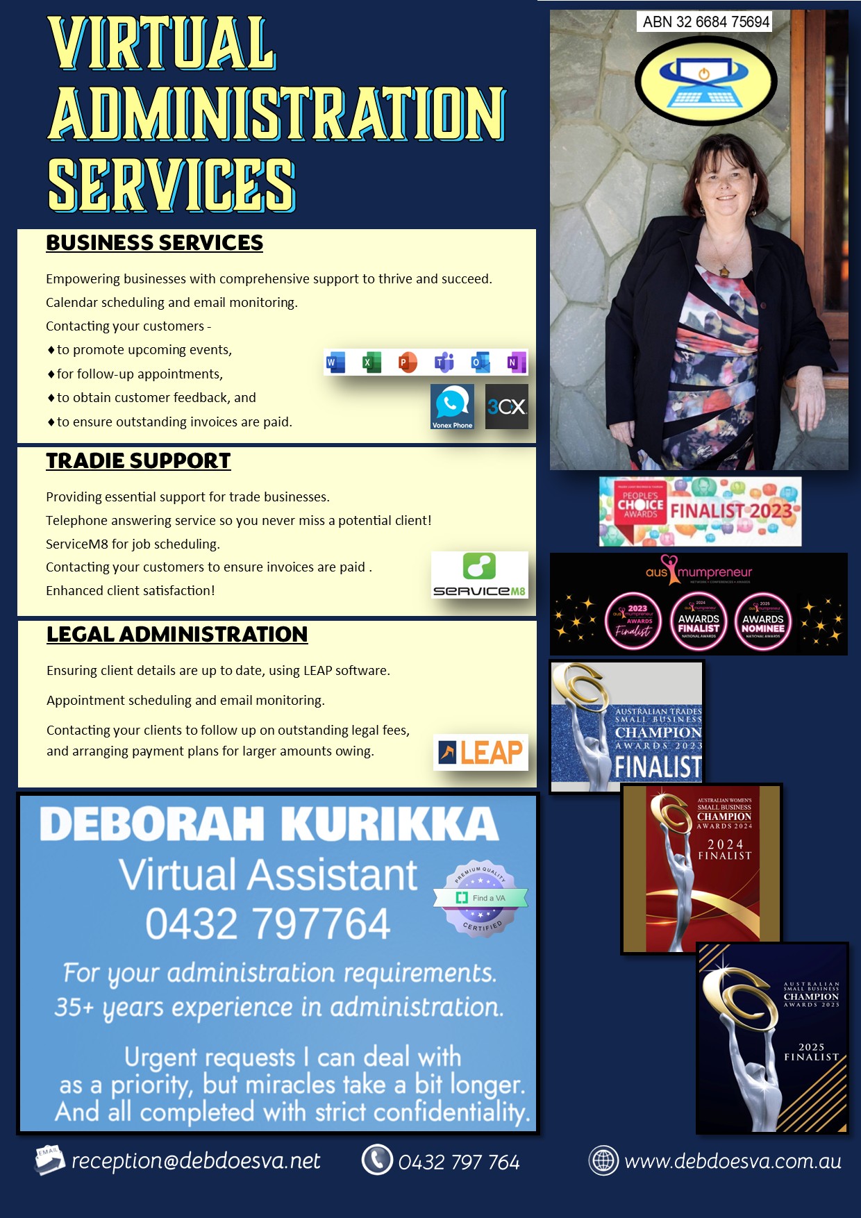 Let me help you streamline your operations and increase your efficiency. With over 35 years experience in administration, I am proficient in Microsoft Office. I also have experience with Google Docs, LEAP, ServiceM8 and Thryv software.